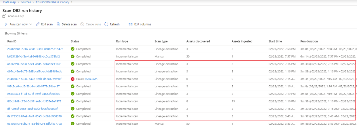 - After you successfully set up the scan, a new scan type called Lineage extraction will run incremental scans every six hours to extract lineage from Azure SQL Database. Lineage is extracted based on the stored procedure runs in the SQL database.