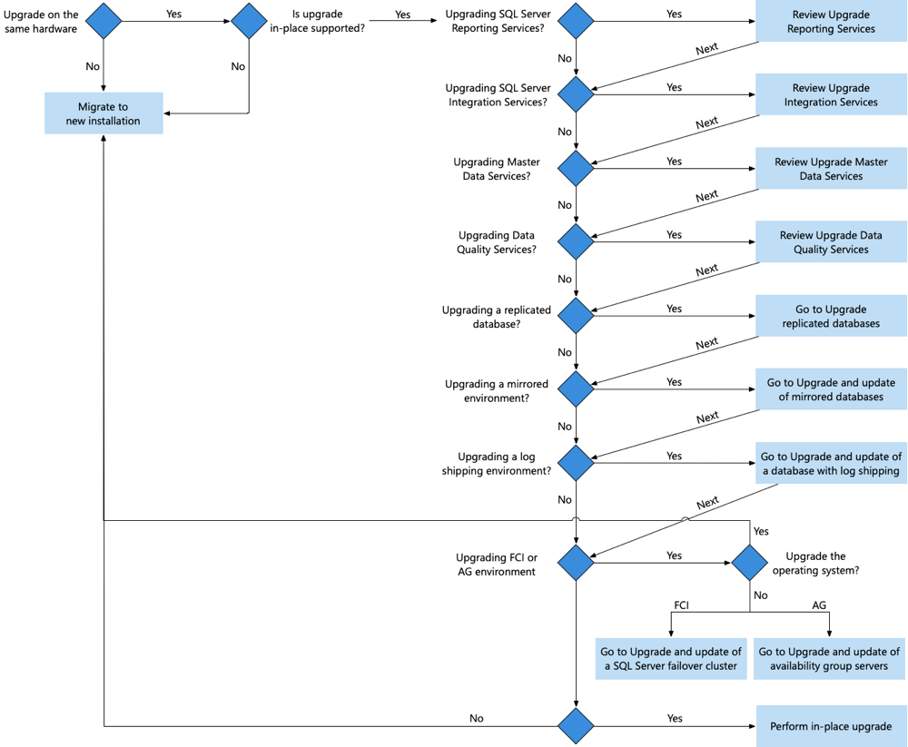 Det finns flera sätt att tänka på när du planerar att uppgradera databasmotorn från en tidigare version av SQL Server för att minimera stilleståndstid och risker. Du kan utföra en uppgradering på plats, migrera till en ny installation eller utföra en löpande uppgradering. Följande diagram hjälper dig att välja bland dessa metoder. Varje metod i diagrammet beskrivs också i artikeln. Om du vill hjälpa dig med beslutspunkterna i diagrammet går du även igenom Planera och testa uppgraderingsplanen för databasmotorn.