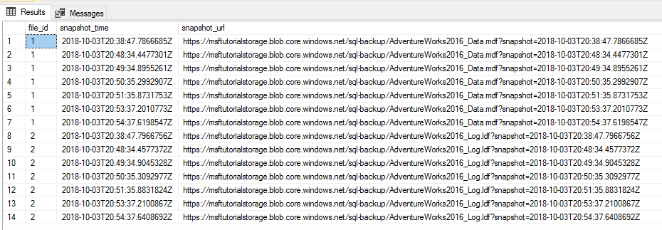 -- Backup the AdventureWorks2022 database with FILE_SNAPSHOT BACKUP DATABASE AdventureWorks2022 TO URL = 'https://<storage-account>.blob.core.windows.net/<container-name>/AdventureWorks2022_Azure.bak' WITH FILE_SNAPSHOT;När du har kontrollerat att skriptet i steg 4 har körts korrekt kör du följande skript igen. Säkerhetskopieringen av filögonblicksbilden i steg 4 genererade filögonblicksbilder av både data och loggfilen.