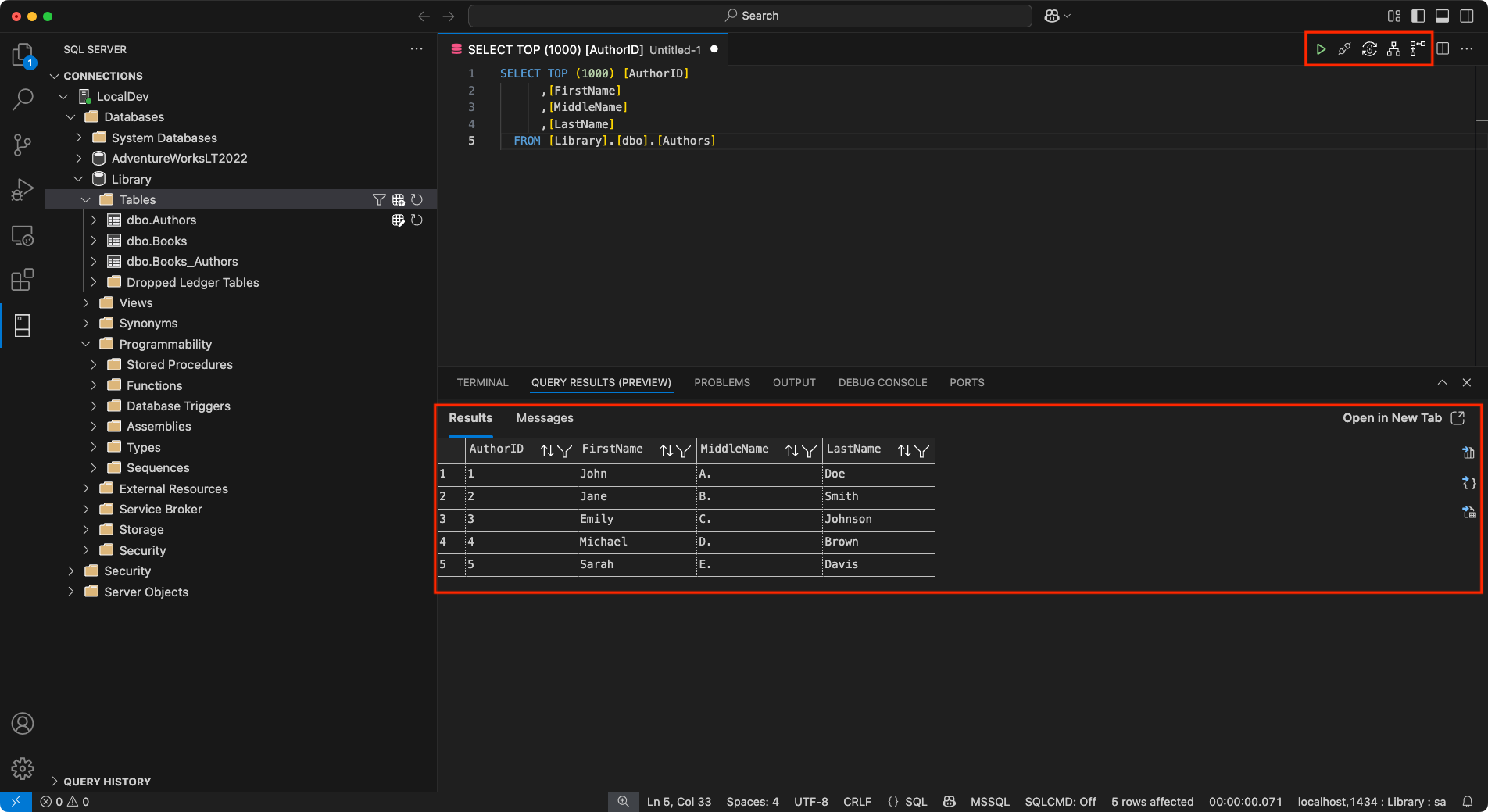 MSSQL-tillägget för Visual Studio Code ger en förbättrad frågeresultatupplevelse som hjälper dig att effektivt visualisera och förstå dina datautdata. Frågeresultaten visas i den nedre panelen i Visual Studio Code, som även är värd för den integrerade terminalen, utdata, felsökningskonsolen och andra verktyg, vilket skapar ett enhetligt gränssnitt för enkel åtkomst.
