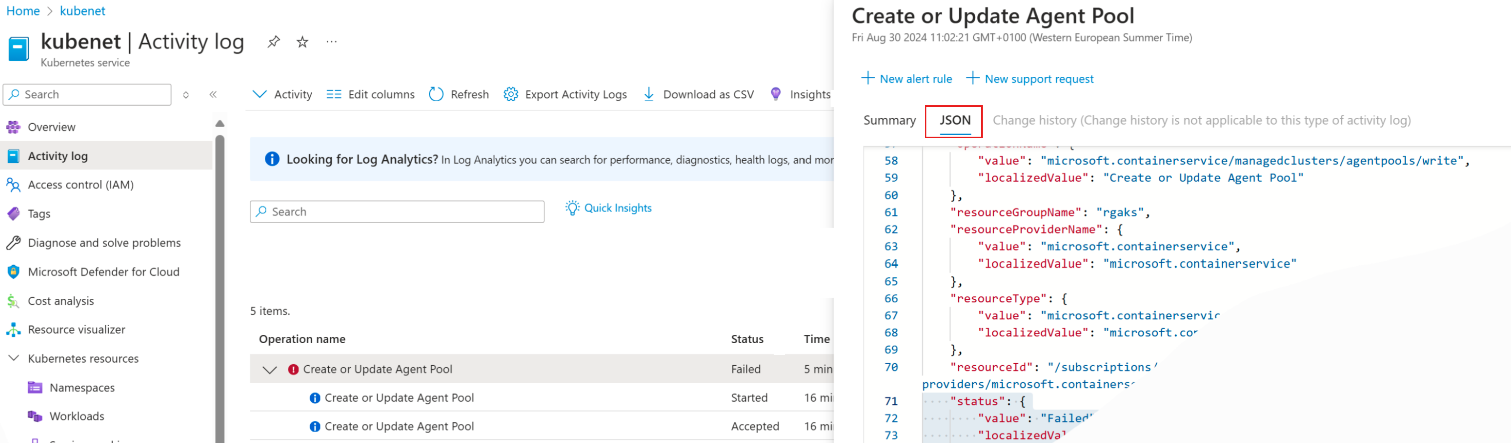 Om du vill undersöka felen när AKS-klustret skapas i Azure Portal öppnar du aktivitetsloggen. Du kan filtrera resultaten så att de passar dina behov. Det gör du genom att välja Lägg till filter för att lägga till fler egenskaper i filtret.
