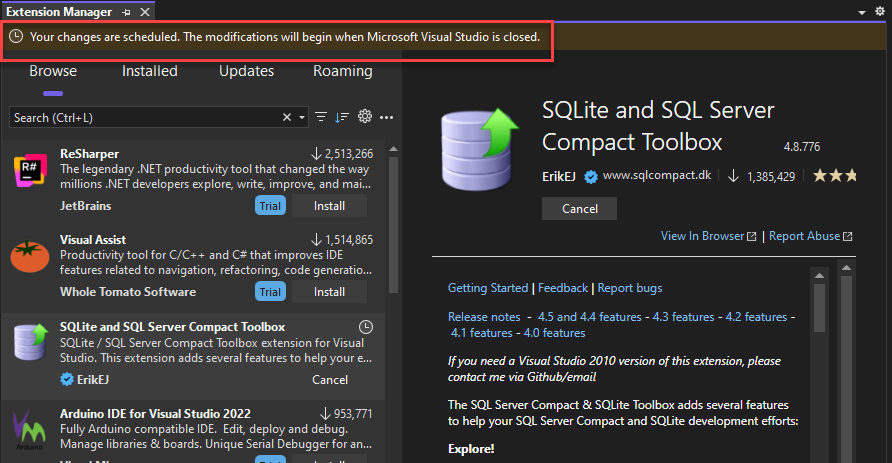 När nedladdningen är klar visas ett meddelande överst i Tilläggshanteraren: "Dina ändringar är schemalagda. Ändringarna börjar när Microsoft Visual Studio stängs."