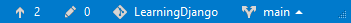 Från vänster till höger visar Git-kontrollfältet antalet utgående/inkommande incheckningar (pilar #/#), antalet ogenomförda ändringar (penna #), det aktuella grennamnet och det aktuella lagringsplatsens namn. Git-kontroller är också tillgängliga på Git-menyn i huvudverktygsfältet.