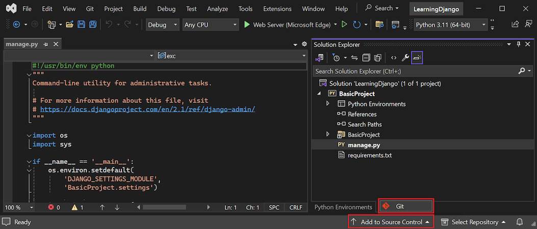 När du har konfigurerat källkontroll för projektet kan du skapa den virtuella miljön med nödvändiga Django-paket som projektet kräver. Du kan sedan använda Team Explorer för att undanta miljöns mapp från källkontrollen.