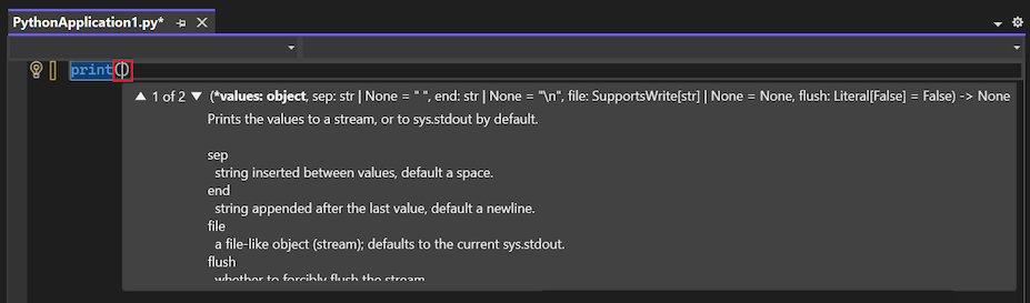 print.När du anger funktionsnamnet visar Visual Studio IntelliSense alternativ för automatisk komplettering för koden. Standardalternativet för slutförande är markerat: