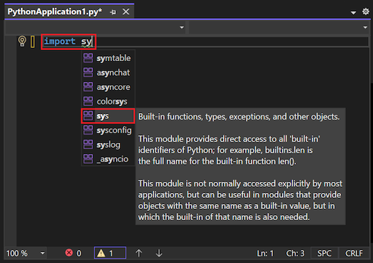 import sys. När du börjar angesysvisar Visual Studio en lista över möjliga moduler för funktionenimport:Du kan bläddra igenom listan för att se hela uppsättningen tillgängliga moduler.