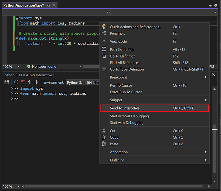 Visual Studio innehåller olika sätt att använda befintlig Python-kod i interaktivt fönster, till exempel kopiera och klistra in och komma åt tidigare angiven kod enligt beskrivningen tidigare. En annan metod är att skicka flera kodrader från ett redigeringsfönster till interaktivt fönster. Med den här funktionen kan du underhålla kod i en källfil och enkelt skicka de valda fragmenten till interaktiva fönstret. Du kan sedan arbeta med kodfragmenten i den snabba REPL-miljön i stället för att behöva köra hela programmet.