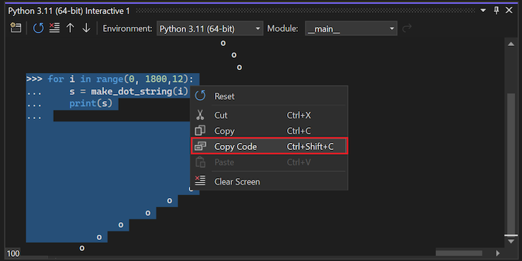 Med Visual Studio kan du kopiera all kod som du skriver i interaktivt fönsteroch även eventuella utdata från att köra koden.