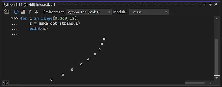 for i in range(360): s = make_dot_string(i) print(s)Åtgärden för att klistra in flera rader är svår att göra i Python-kommandoradens REPL-upplevelse. När du har klistrat in koden kör interaktivt fönster koden som om du angav den direkt i fönstret: