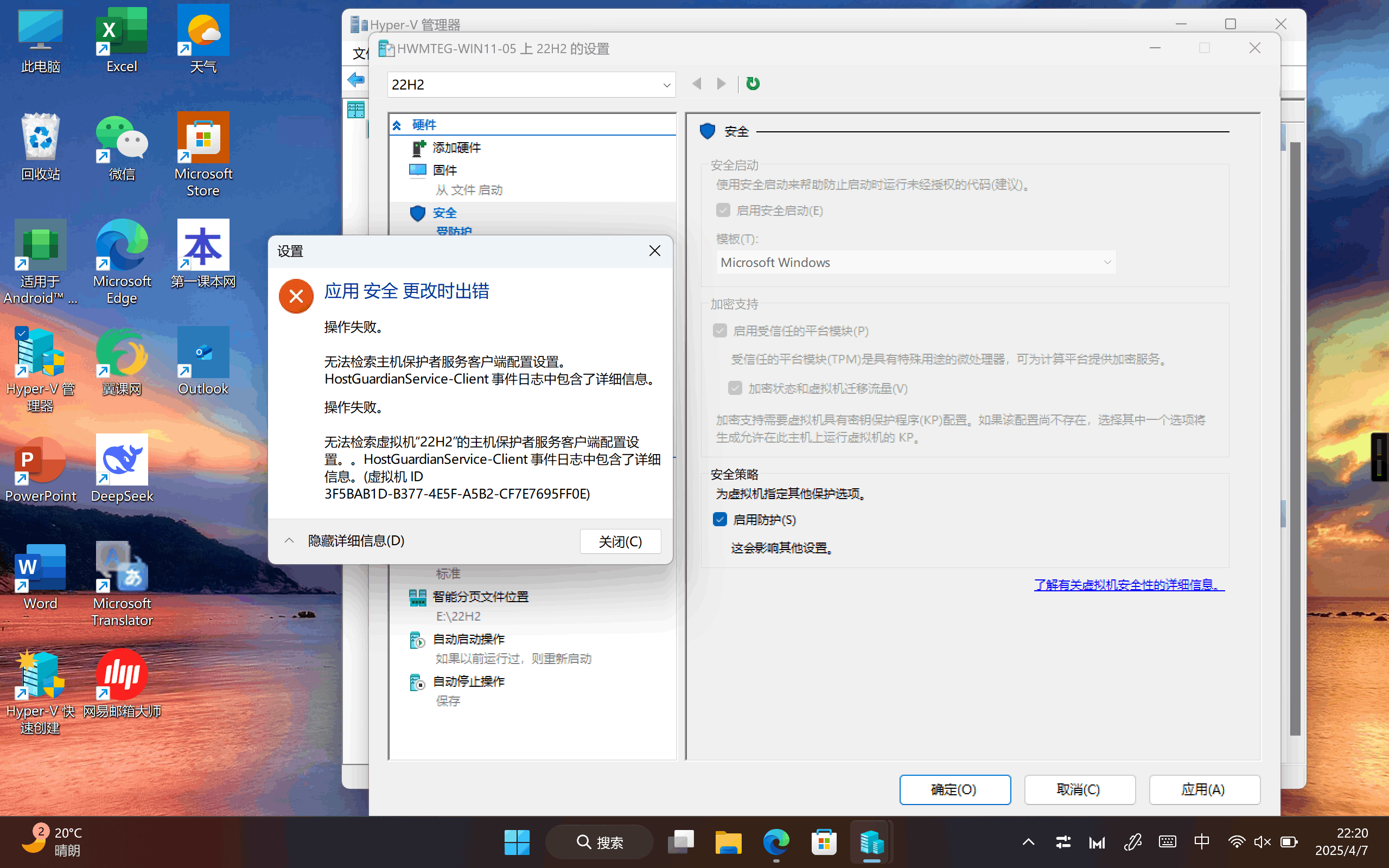 图中的错误窗口是在点击了”应用”后弹出的。我点击了”启用防护”,要开TPM,报错。然后我把启用防护关掉,单独打开TPM,报一模一样的错。