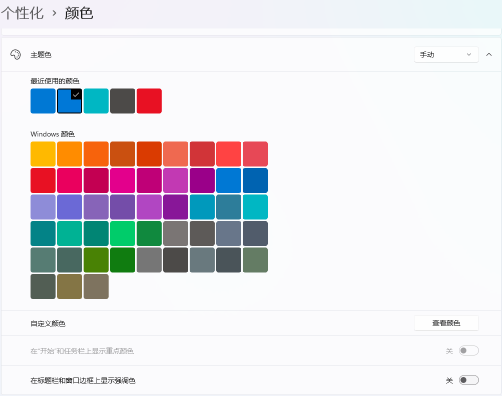 请问您所说的无法切换回去是指“个性化”中的“标题栏和窗口显示强调色”选项变灰嘛?