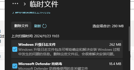 感谢您的反馈,根据您的描述您无法删除系统中的一些临时文件,这可能是一个显示的问题。您可以到以下路径直接删除这些windows 升级日志文件,如果这些文件夹中文件已经不存在那么说明您已经通过设置删除了这个文件,之所以显示占用可能是设置的显示问题,如果文件存在那么说明设置了清除临时文件的功能出现损坏,您可以尝试手动删除。