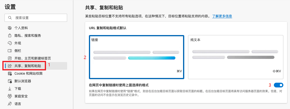 由于目前可能是Mac更新后引入的安全策略更改影响超链接的处理,导致当前复制的网页链接就是URL形式,那么您粘贴到office中也将保持URL形式,关于这一点可能需要向苹果反馈以做出相应的改进。 但是目前在测试中我又找出一种替代方案,如果您在处理大量数据,那么这种方法将会比通过备忘录复制粘贴更为便捷。即下载Microsoft Edge dev版,并开启以下设置,即可实现您复制的网页链接粘贴到Excel中依然保持文本超链接的形式。需要注意的是使用此方法您需要将Microsoft Edge dev设置为默认浏览器。
