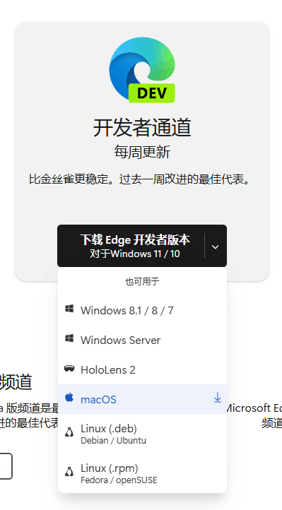 您可以访问以下链接下载并安装Microsoft Edge dev版。对于不同的系统版本Edge安装包也存在不同。因此,在下载时您需要选择适配于Mac的安装包。