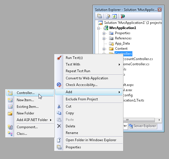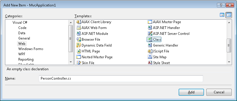 ASP.NET MVC 控制器只是一个类。 如果愿意,可以忽略方便的 Visual Studio 控制器基架,手动创建控制器类。 按照以下步骤操作: