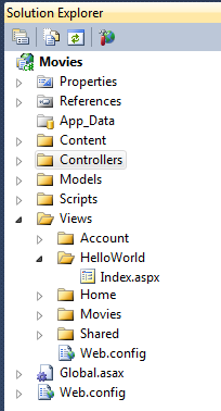 单击“添加”后,解决方案文件夹中将显示一个新文件夹和新文件,如下所示。 现在,“视图”下有一个 HelloWorld 文件夹,在该文件夹中有一个 Index.aspx 文件。