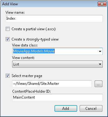 完成这些步骤会将名为Edit.aspx的新视图添加到 Views\Home 文件夹。 此视图包含用于编辑电影记录的 HTML 窗体。