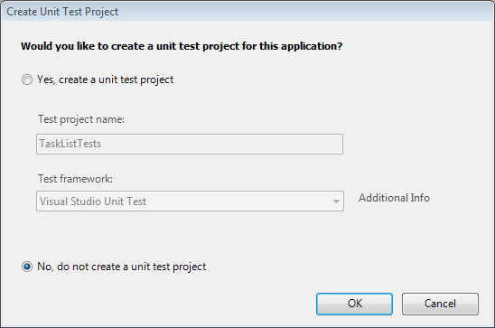 每当创建新的 MVC Web 应用程序项目时,Visual Studio 会提示你创建单独的单元测试项目。 此时会显示图 2 中的对话框。 由于由于时间限制(是的,因此我们不会在本教程中创建测试),因此选择“否”选项,然后单击“确定”按钮。