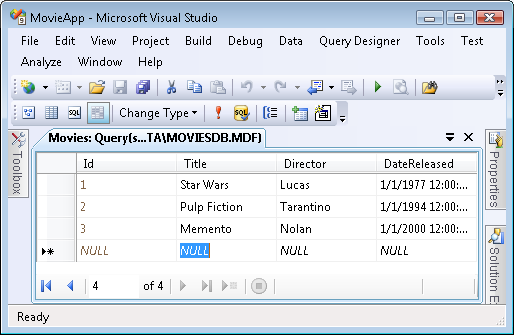 创建数据库后,可以通过双击位于App_Data文件夹中的MoviesDB.mdf文件连接到数据库。 双击MoviesDB.mdf文件将打开“服务器资源管理器”窗口。
