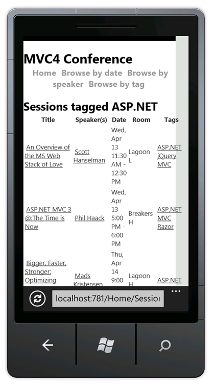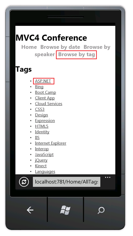 按 Ctrl + F5 运行该应用程序,它将在桌面浏览器中显示。 启动移动浏览器模拟器,将会议应用程序的 URL 复制到模拟器中,然后单击“ 按标记浏览 ”链接。 如果您使用的是 Windows Phone Emulator,则在 URL 栏中单击并按“暂停”键来访问键盘。 下图显示了从选择“按标记) 浏览” (的“AllTags”视图。