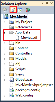 Entity Framework Code First 检测到所提供的数据库连接字符串指向Movies尚不存在的数据库,因此 Code First 会自动创建数据库。 可以通过在 App_Data 文件夹中查找来创建它。 如果未看到 Movies.sdf 文件,请单击解决方案资源管理器工具栏中的“显示所有文件”按钮,单击“刷新”按钮,然后展开App_Data文件夹。