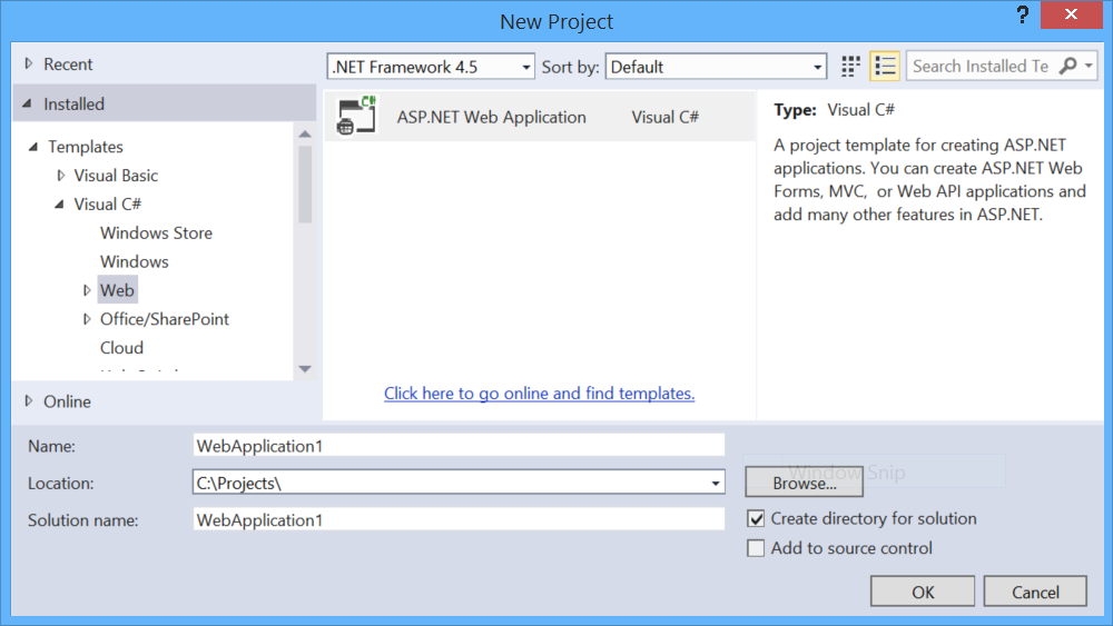 首先,我们将创建一个新的 ASP.NET Web 应用程序项目。 在 Visual Studio 的“ 文件 ”菜单中,选择“ 新建>项目”。 在 “模板”下的“ Web”下,选择“ ASP.NET Web 应用程序”。