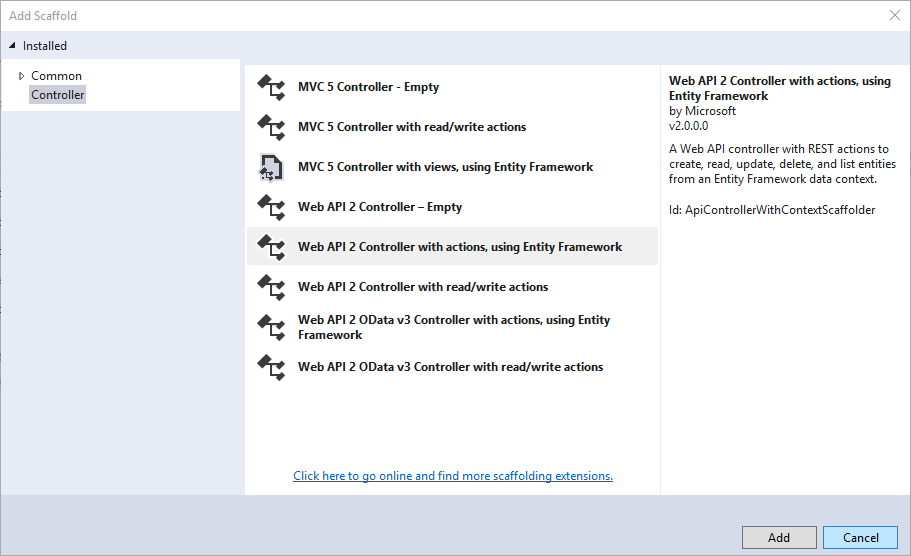 在 “添加基架 ”对话框中, 使用实体框架选择包含操作的 Web API 2 控制器。