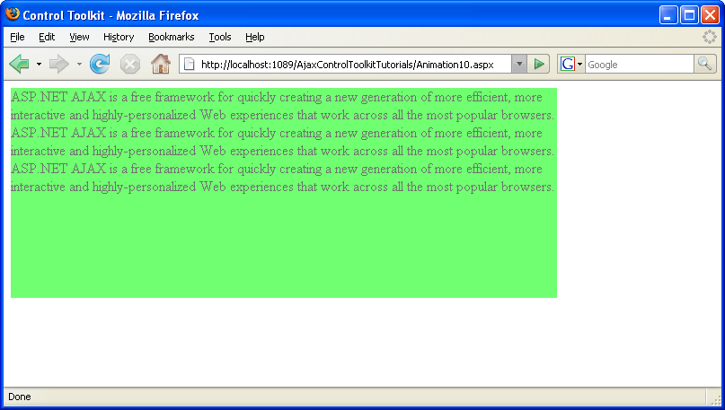 ASP.NET AJAX 控件工具包中的动画控件不仅是一个控件,而且是用于向控件添加动画的整个框架。 还可以使用自定义客户端 JavaScript 代码触发动画执行。