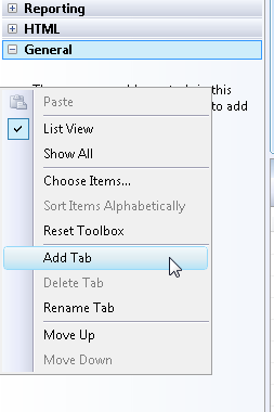 - 右键单击“常规”选项卡下的“工具箱”,然后选择菜单选项 “添加选项卡 ” (请参阅图 4) 。