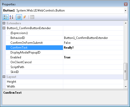 6. 选择Designer中的“按钮”控件,然后展开“扩展程序”,Button1_ConfirmButtonExtender属性窗口 (中的节点,请参阅图 6) 。 将值 “真的?” 分配给 ConfirmText 属性。