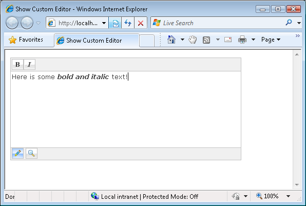 通过从基编辑器类派生新的 HTML 编辑器来自定义工具栏按钮。 例如,清单 2 中的自定义编辑器仅包含粗体和斜体工具栏按钮。 已删除所有其他工具栏按钮。 此外,“HTML”选项卡已从编辑器 (底部删除,但“设计和预览”选项卡仍) 。