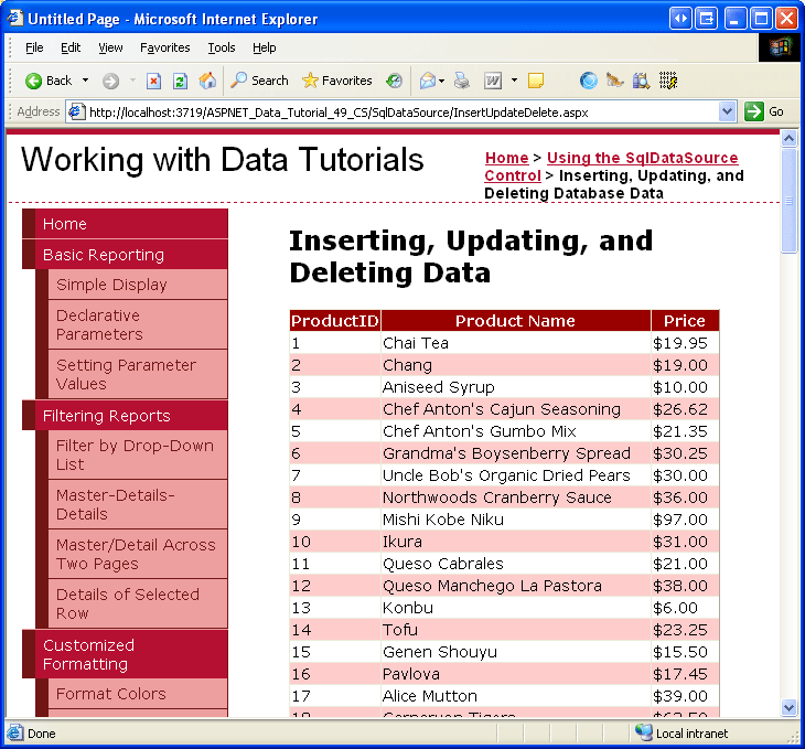 首先从InsertUpdateDelete.aspx文件夹中打开Querying.aspx和SqlDataSource页面。 从 Querying.aspx 页面上的设计器处,选择第一个示例中的 SqlDataSource 和 GridView 这两个控件(即 ProductsDataSource 和 GridView1 控件)。 选择两个控件后,转到“编辑”菜单,然后选择“复制”(或只需按 Ctrl+C)。 接下来,转到 InsertUpdateDelete.aspx 设计器,并粘贴控件。 在你将两个控件移到InsertUpdateDelete.aspx之后,在浏览器中测试页面。 您应该看到ProductID数据库表中所有记录的ProductName、UnitPrice和Products列的值。