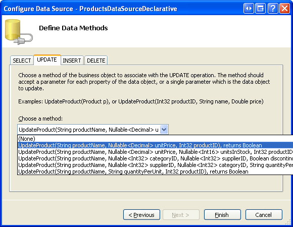 将 ObjectDataSource 配置为使用 ProductsBLL 类,并将 SELECT 选项卡中的下拉列表设置为 GetProducts()。 在“更新”选项卡中,选择一个具有三个输入参数UpdateProduct、productName和unitPrice的重载productID。 在 INSERT 和 DELETE 选项卡中将下拉列表设置为“无”。