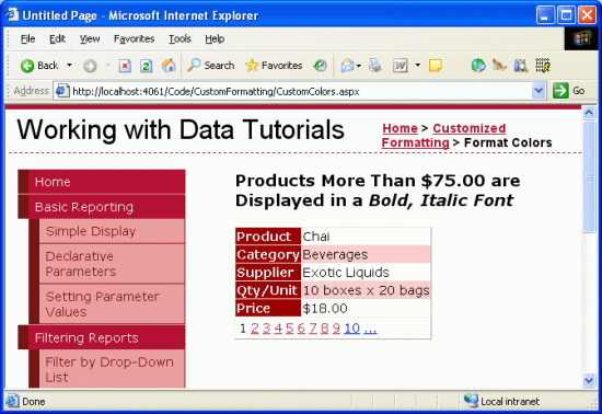 最后一步是,如果UnitPrice该行的值小于 10.00 USD,则以编程方式突出显示整个GridViewRow。 访问 GridView 的行或单元格的语法与使用 DetailsView GridViewID.Rows(index) 访问整行以 GridViewID.Rows(index).Cells(index) 访问特定单元格的语法相同。 但是,当事件处理程序触发时 RowDataBound ,数据绑定 GridViewRow 尚未添加到 GridView 的集合 Rows 中。 因此,您无法使用 Rows 集合从RowDataBound事件处理程序访问当前GridViewRow实例。