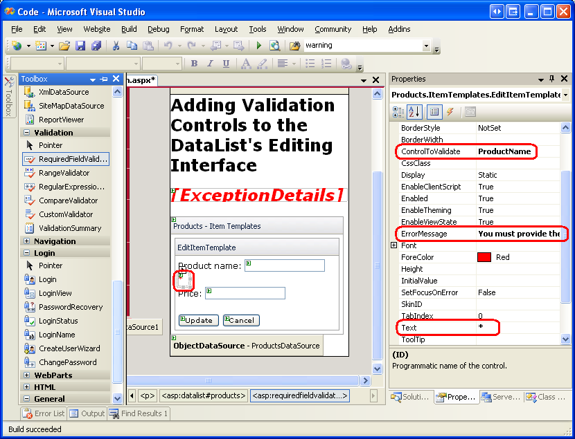 到目前为止,在 DataList 编辑教程中,DataLists 编辑界面不包含任何主动用户输入验证,即使用户输入无效(如缺少产品名称或负价格)也会导致异常。 在 前面的教程中 ,我们研究了如何将异常处理代码添加到 DataList 事件处理程序 UpdateCommand ,以便捕获和正常显示有关引发的任何异常的信息。 但是,理想情况下,编辑界面将包含验证控件,以防止用户首先输入此类无效数据。