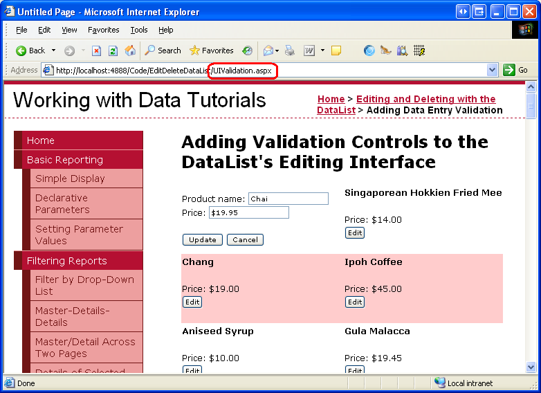 在 处理 BLL 和 DAL-Level 异常 教程中,我们创建了一个页面,其中列出了两列可编辑 DataList 中产品的名称和价格。 本教程的目标是扩充 DataList 的编辑界面,以包含验证控件。 具体而言,验证逻辑将: