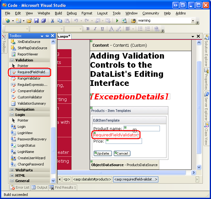 首先,将必要的验证控件添加到 DataList s EditItemTemplate。 可以通过设计器执行此任务,方法是单击 DataList 智能标记中的“编辑模板”链接或通过声明性语法执行。 让我们使用“设计”视图中的“编辑模板”选项逐步完成该过程。 选择编辑 DataList s EditItemTemplate后,通过将 RequiredFieldValidator 从工具箱拖动到模板编辑界面中来添加 RequiredFieldValidator,并将其放在 TextBox 之后 ProductName 。
