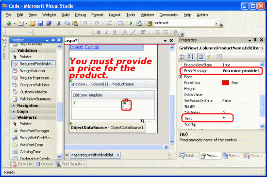 图 7:设置 RequiredFieldValidator 的ControlToValidate和ErrorMessageText属性(单击以查看全尺寸图像)