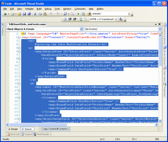 DataModificationEvents.aspx在 Visual Studio 中打开页面 - 转到页面的声明性标记(单击页面底部的“源”按钮)