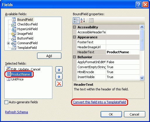 若要将验证控件添加到编辑和插入接口,需要将 DetailsView 和 GridView 控件使用的 BoundFields 转换为 TemplateFields。 为此,请单击 GridView 和 DetailsView 智能标记中的“编辑列”和“编辑字段”链接。 在那里,选择每个 BoundFields,然后单击“将此字段转换为 TemplateField”链接。