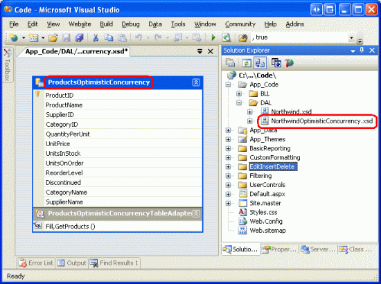 首先,我们不是扩展现有的 DAL 的 TableAdapters 来使用乐观并发(这样做需要更改 BLL 以适应),而是创建一个名为 NorthwindOptimisticConcurrency 的新类型化数据集,并向其中添加一个使用乐观并发的 Products TableAdapter。 接下来,我们将创建一个 ProductsOptimisticConcurrencyBLL 业务逻辑层类,该类具有适当的修改以支持乐观并发 DAL。 完成此基础工作后,我们将准备好创建 ASP.NET 页面。