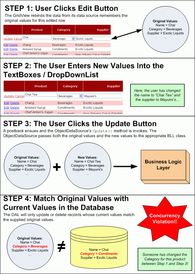 乐观并发控制的工作原理是确保更新或删除的记录与更新或删除进程启动时的值相同。 例如,单击可编辑 GridView 中的“编辑”按钮时,记录的值将从数据库读取,并显示在 TextBoxes 和其他 Web 控件中。 这些原始值由 GridView 保存。 稍后,在用户进行更改并单击“更新”按钮后,原始值加上新值将发送到业务逻辑层,然后向下发送到数据访问层。 数据访问层必须发出 SQL 语句,只有在用户开始编辑的原始值与数据库中的值相同时,才会更新记录。 图 2 描述了此事件序列。