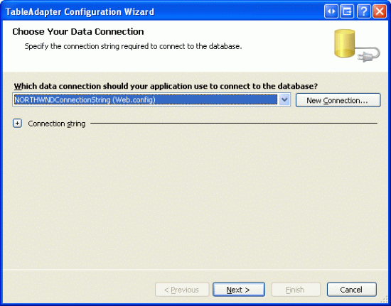 若要创建新的类型化数据集,请 DAL 右键单击该文件夹中的文件夹 App_Code ,并添加一个名为 NorthwindOptimisticConcurrency的新数据集。 正如我们在第一个教程中看到的那样,这样做会将新的 TableAdapter 添加到 Typed DataSet,并自动启动 TableAdapter 配置向导。 在第一个屏幕中,系统会提示指定要连接到的数据库 - 使用 NORTHWNDConnectionString 设置从 Web.config中连接到同一 Northwind 数据库。