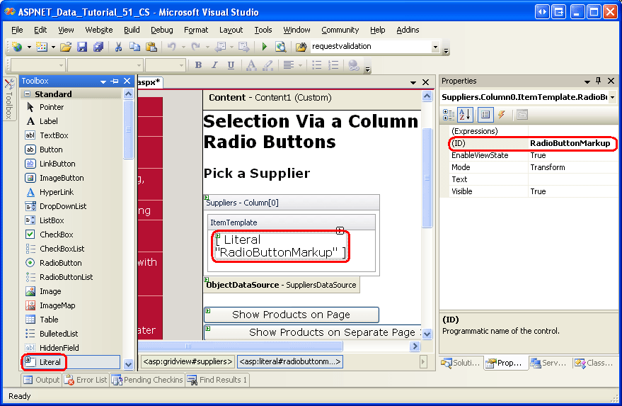 此时,Suppliers GridView 已显示三个 BoundFields,分别展示美国供应商的公司名称、所在城市和国家。 但是,它仍然缺少单选按钮列。 遗憾的是,GridView 不包含内置 RadioButtonField,否则我们只需将它添加到网格中即可完成。 相反,我们可以添加一个 TemplateField,并配置其 ItemTemplate 以呈现单选按钮,从而在每个 GridView 行中生成一个单选按钮。