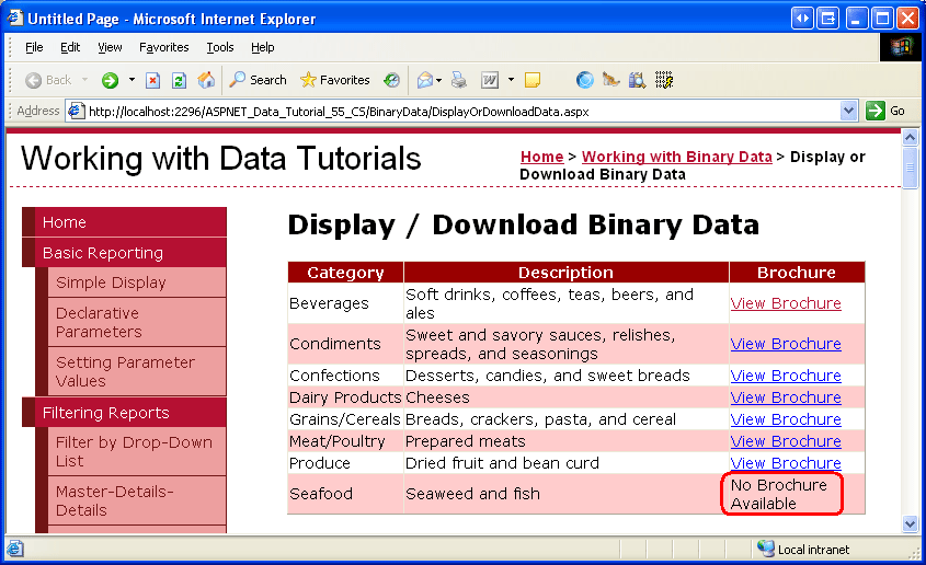 此方法确定传入 Object 值是否为数据库 NULL ,如果是,则返回一条消息,指示该类别缺少小册子。 否则,如果存在 BrochurePath 值,则会在超链接中显示该值。 请注意,如果存在该值 BrochurePath ,则将其传递到 ResolveUrl(url) 方法中。 此方法解析传入的 url,将字符 ~ 替换为相应的虚拟路径。 例如,如果应用程序植根于该位置 /Tutorial55, ResolveUrl("~/Brochures/Meats.pdf") 将返回 /Tutorial55/Brochures/Meat.pdf。