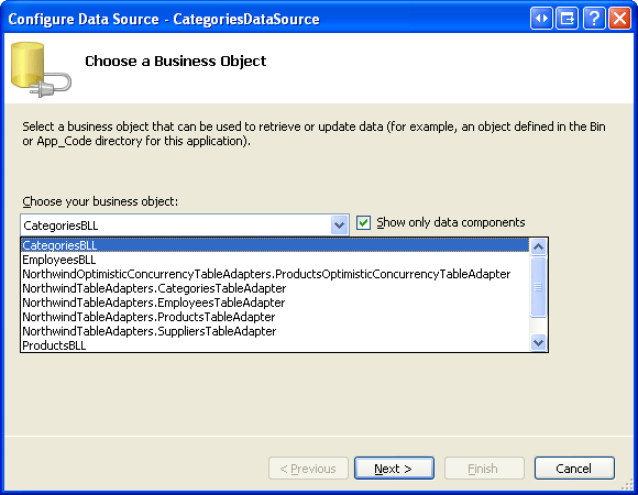图 3:将 ObjectDataSource 配置为使用 CategoriesBLL 类(单击以查看全尺寸图像)