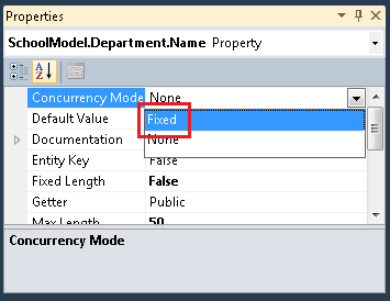 打开 SchoolModel.edmx,在数据模型设计器中右键单击 Name 实体中的 Department 属性,然后单击“ 属性”。 在 “属性” 窗口中,将 ConcurrencyMode 属性更改为 Fixed。