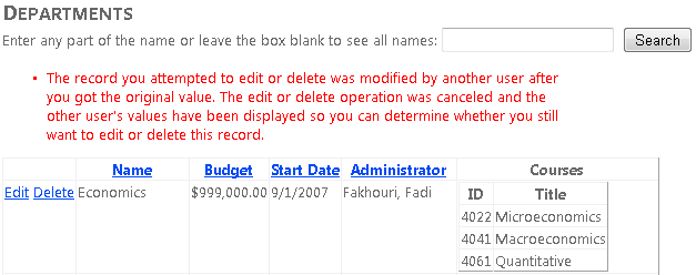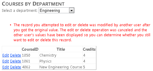 SchoolRepository,处理 方法中的SaveChanges并发异常。 - 在 Departments.aspx 页中,通过向用户显示警告尝试的更改失败的消息来处理并发异常。 然后,用户可以查看当前值,并重试更改(如果仍需要)。