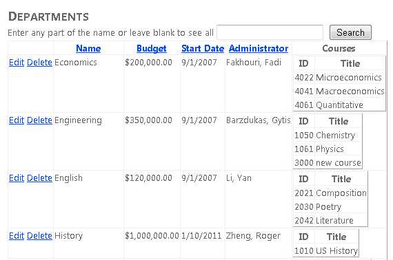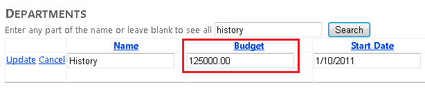 单击行中的 “编辑” ,然后更改“ 预算 ”列中的值。 (请记住,您只能编辑为本教程创建的记录,因为现有的 School 数据库记录包含一些无效数据。经济系的记录是一个安全的试验。)