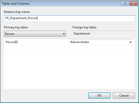 在“ 表和列 ”对话框中,将主键表和字段设置为 Person 和 PersonID,并将外键表和字段设置为 Department 和 Administrator。 (执行此操作时,关系名称将从 更改为 FK_Department_DepartmentFK_Department_Person.)